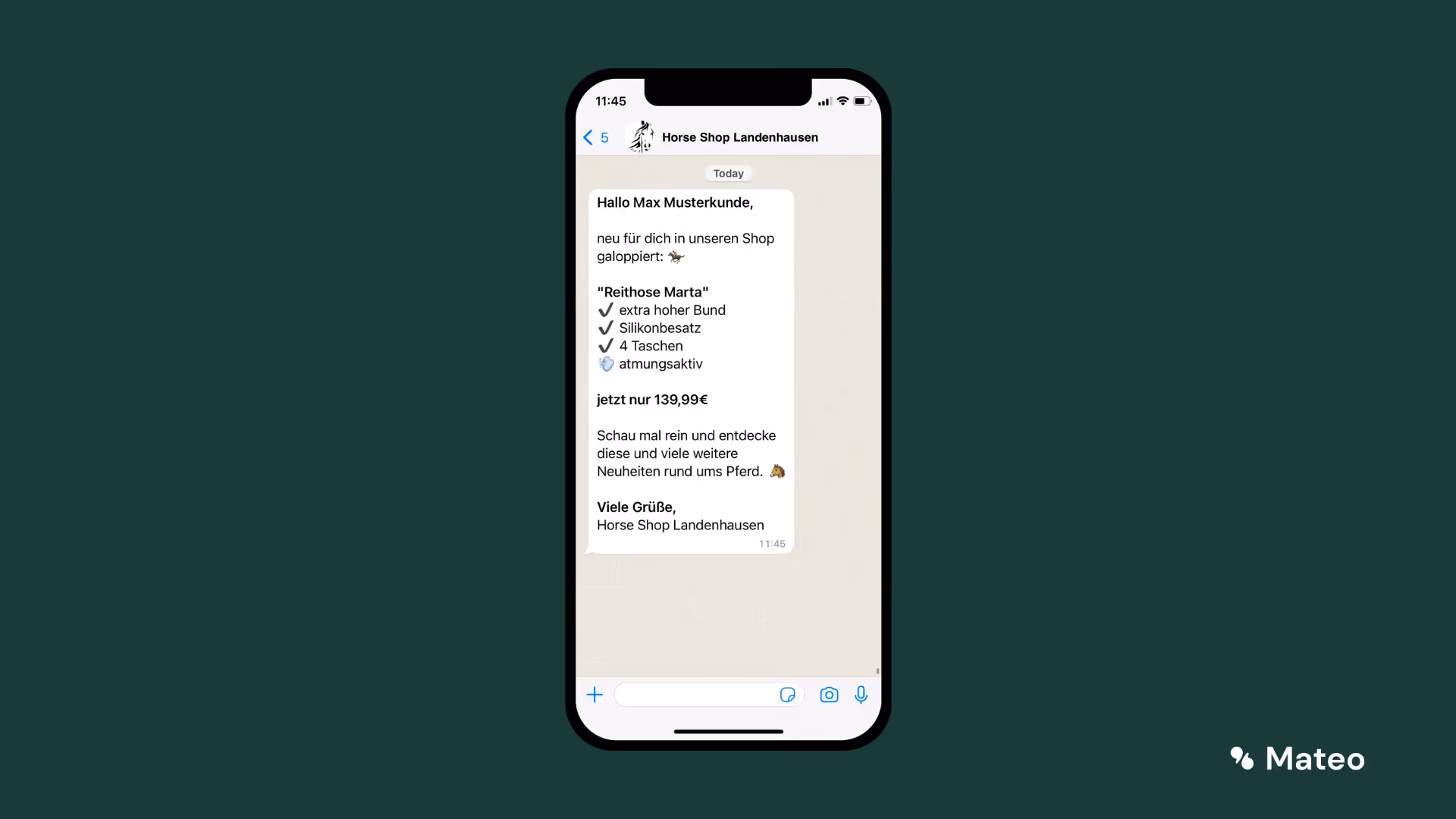 hellomateo bietet mit dem WhatsApp Newsletter Marketing einen umfangreichen Service im Bereich des Conversational Marketing. Das Dienstleistungsportfolio reicht von der Einrichtung der WhatsApp API über individuelle Tipps zum Einsammeln von Opt-Ins, dem Pflegen von Kundendaten und der Erstellung von Newslettern bis hin zu tiefgründigen Analysen. Ein umfänglicher Service mit Fokus auf Conversational Marketing und Conversational Commerce, der Ihrem Unternehmen individuell angepasst wird.